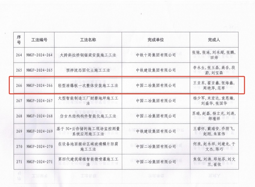 近日,從內(nèi)蒙古自治區(qū)住房和城鄉(xiāng)建設廳傳來喜訊,市政分公司申報的《輕型泄爆板安裝施工工法》成功獲評2024年度內(nèi)蒙古自治區(qū)省級工法。
