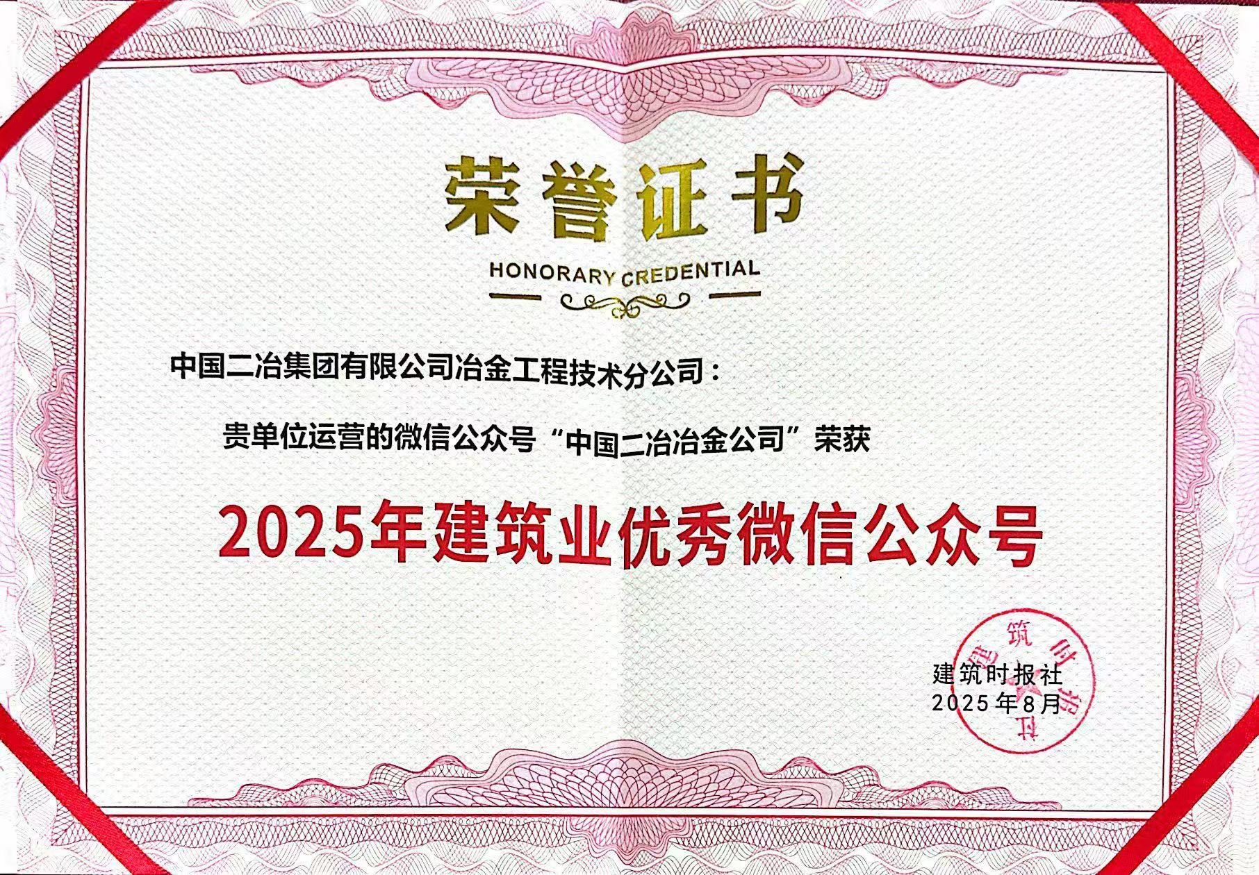 近日,中國(guó)二冶冶金分公司運(yùn)營(yíng)的微信公眾號(hào)榮獲建筑時(shí)報(bào)社頒發(fā)的“2025年建筑業(yè)優(yōu)秀微信公眾號(hào)”稱號(hào)。這一榮譽(yù)不僅是對(duì)冶金分公司新媒體運(yùn)營(yíng)工作的充分肯定,更是對(duì)中國(guó)二冶品牌影響力和企業(yè)文化傳播力的高度認(rèn)可。