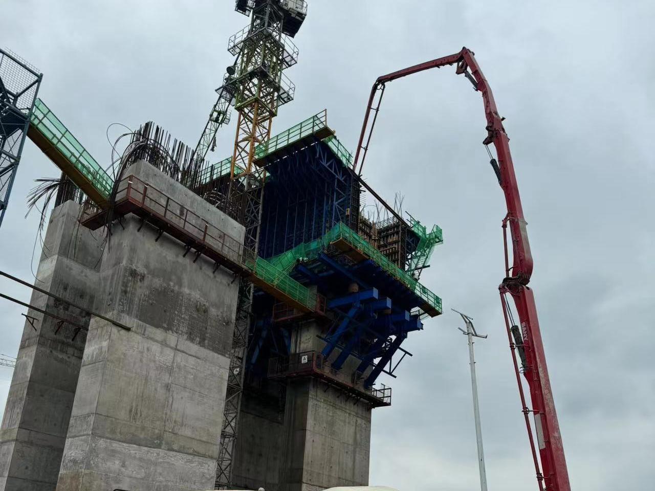 該0#塊箱梁,長12米,頂板寬達(dá)12.75米,底板寬度為6.75米,腹板80厘米,整塊梁段重達(dá)983.6噸。澆筑前,項(xiàng)目部制定了周密的施工計(jì)劃,由于0#塊鋼筋、鋼絞線密集,混凝土澆筑高度大,為確?;炷翝仓|(zhì)量,澆筑過程中,項(xiàng)目部依照“豎向分段、水平分層”的澆筑原則,遵循先底板、再腹板對稱、最后頂板的澆筑順序,嚴(yán)格遵循了托上現(xiàn)澆的施工工藝。1臺泵車連續(xù)澆筑,1臺泵車備用,采用水平分層的工藝,前后兩層混凝土的間隔時間不超過1小時。底板澆筑時,縱橋向先澆筑墩頂中橫梁部位,再逐漸由兩端向墩頂水平分層進(jìn)行,橫橋向?yàn)閮蓚?cè)腹板向連續(xù)梁中間方向?qū)ΨQ均衡進(jìn)行;腹板澆筑時,按縱向水平分層澆筑,分層厚度為30厘米,橫橋向各腹板左右相互交替連續(xù)澆筑,如此循環(huán),直至腹板混凝土澆筑完畢;頂板澆筑時,縱橋向從懸臂端部向根部進(jìn)行,橫橋向?yàn)橛傻偷礁邚膽冶鄱讼蚋窟M(jìn)行。歷時10個小時,項(xiàng)目建設(shè)團(tuán)隊(duì)依次進(jìn)行托架的搭設(shè)與底模的安裝,托架預(yù)壓和底模調(diào)整,鋼筋綁扎、模板安裝等工序,確保了工程的穩(wěn)固與安全。最后,經(jīng)過混凝土澆筑、養(yǎng)護(hù)以及預(yù)應(yīng)力施工的精細(xì)操作,圓滿完成了0#塊箱梁的澆筑工作。