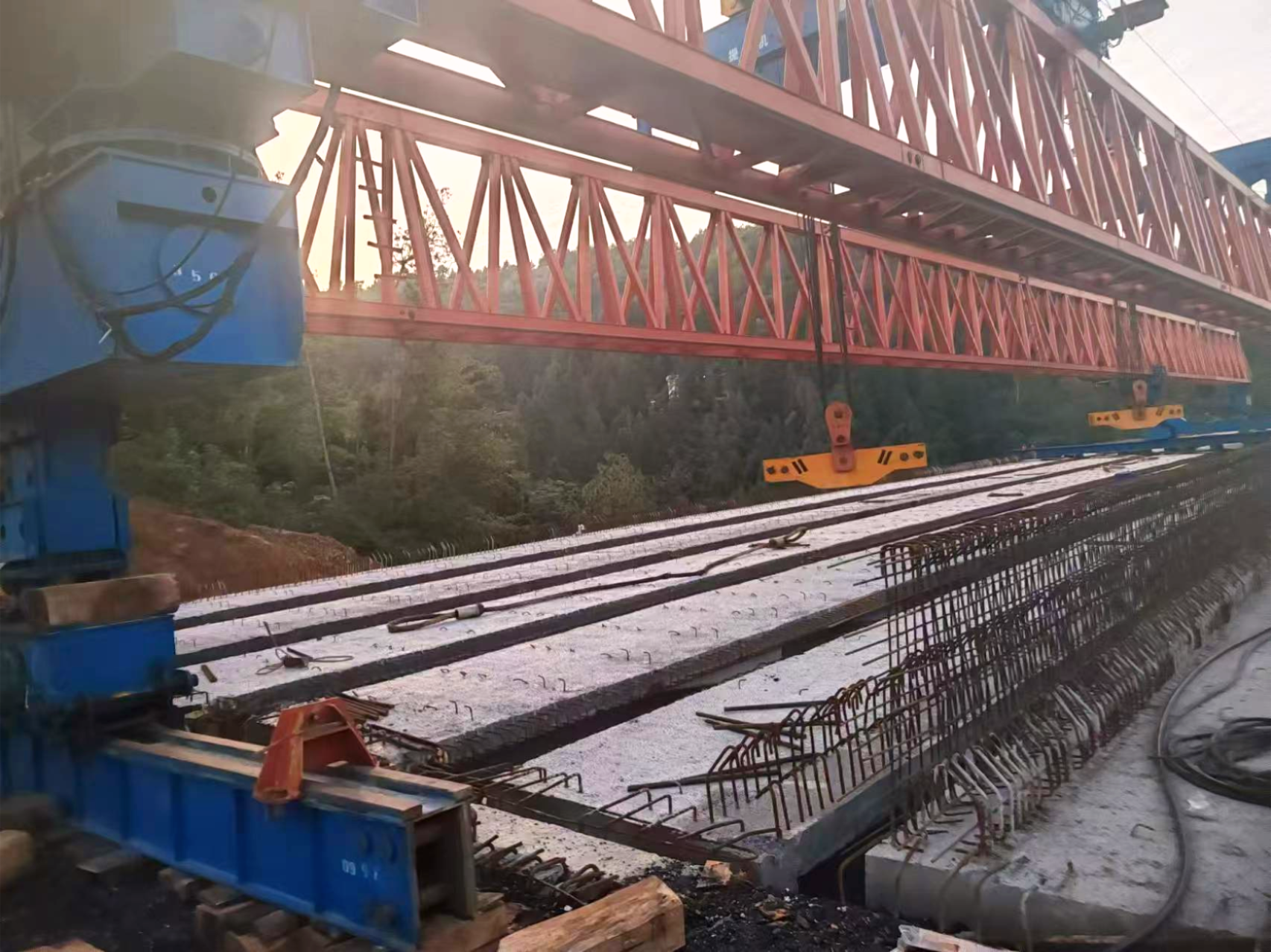 施工過程中,全橋共使用2臺架橋機,4臺運梁車進行施工。項目全線橋梁巖溶發育強烈,見溶率較高,橋區地質情況復雜,歷時一個月,項目團隊上下一心,通力協作,順利完成此次大橋T梁架設任務,為全線早日通車夯實基礎。