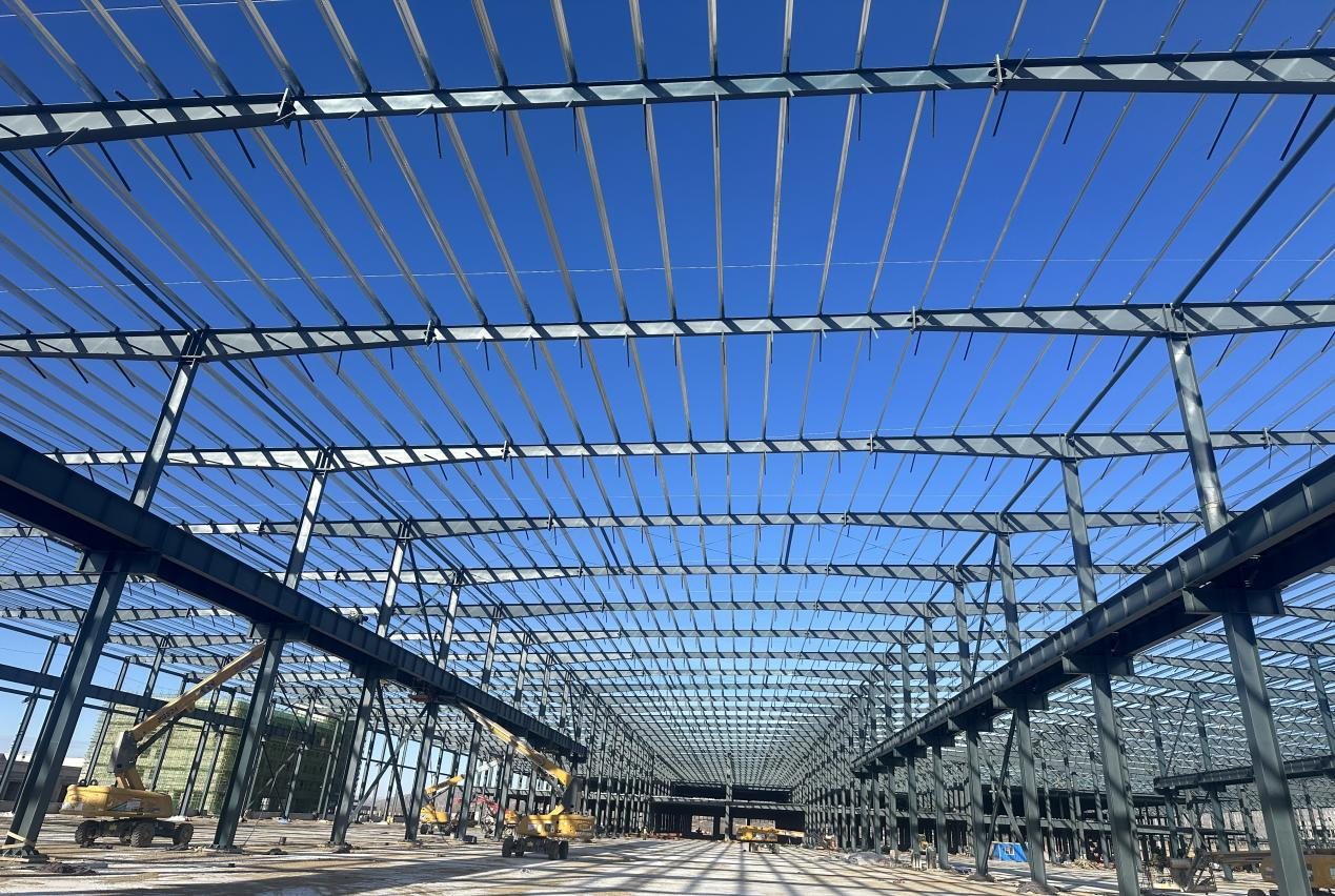 緯景儲能鋅鐵液流電池(包頭)智造基地建設項目,位于內蒙古自治區包頭市青山區。項目建設用地面積約208075.97平方米,建筑面積約152150.68平米。廠房A區長199米,寬180米,單體建筑面積約36000平方米。結構形式為單層多跨剛架廠房,最大跨度40米。屋蓋系統為焊接實腹屋面梁、冷彎薄壁C型檁條、角鋼支撐,圓鋼管系桿;柱子系統采用焊接十字型鋼柱、縱向設置柱間支撐及剛性系桿;吊車梁系統采用焊接工字型實腹式鋼吊車梁。