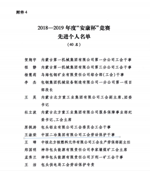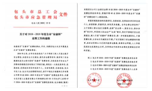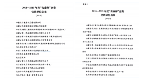 近日,公司兩家單位獲得包頭市2018-2019年度“安康杯”競賽優勝單位、優勝班組稱號,一人獲得先進個人稱號。這是公司連續3年在包頭市“安康杯”競賽中獲得殊榮。