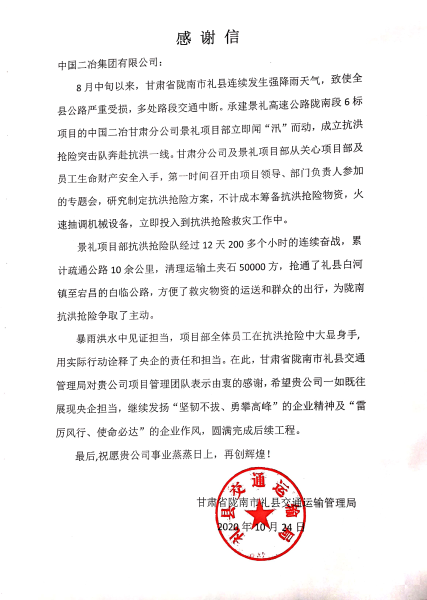 10月26日,甘肅省隴南市禮縣交通運輸局發來感謝信,對中國二冶集團甘肅分公司景禮項目部在抗洪救災活動中做出的突出貢獻表示衷心感謝。