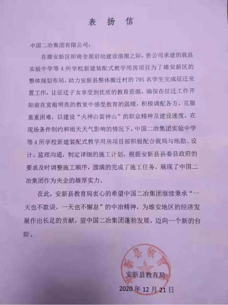 近日,中國(guó)二冶集團(tuán)分別收到雄安新區(qū)安新鎮(zhèn)人民政府和安新縣教育局發(fā)來(lái)表?yè)P(yáng)信,信中對(duì)中國(guó)二冶房地產(chǎn)公司在項(xiàng)目建設(shè)中履行央企責(zé)任,彰顯央企實(shí)力與擔(dān)當(dāng)給予了高度贊譽(yù)。