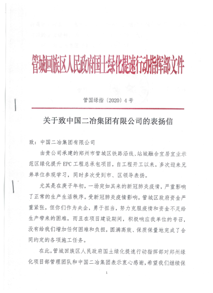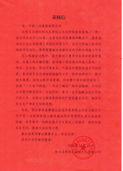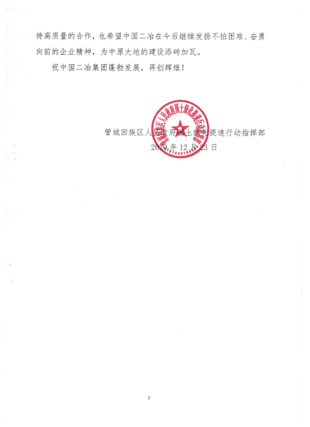 表揚信中,對中國二冶給予該項目的高度重視表示感謝,對于選派的項目團隊、先進的施工理念、優質的施工服務給予了高度贊揚。對于項目部自6月份中標后進駐施工現場以來,面對施工區域規劃不完善、工期緊、涉及專業多、協調部門多等諸多不利因素,公司領導多次深入施工現場指導工作,積極協調各方、解決技術難題,項目團隊精心組織,加班加點,發揚了“堅韌不拔,勇攀高峰”的企業精神,圓滿完成了2020年既定的施工生產任務,對于項目部的高效優質的服務意識給予了充分肯定,同時希望中國二冶要繼續關心、關注項目的后續建設任務,希望項目團隊要繼續發揚優良的工作作風,圓滿完成項目的后續施工任務。