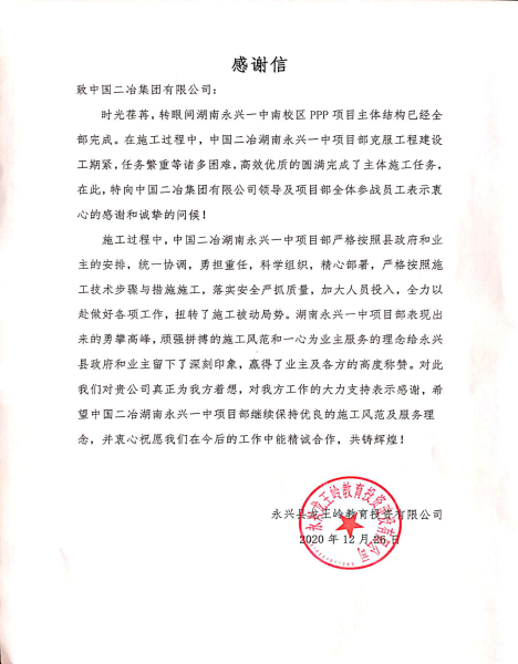 12月26日,湖南省郴州市永興縣龍王嶺教育投資有限公司向中國二冶集團發來感謝信,對中國二冶鋼構公司永興一中南校區項目部在施工過程中充分履行央企責任予以高度評價和感謝。