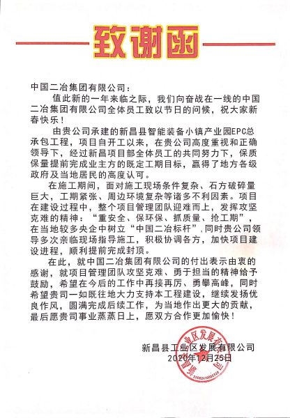 12月28日,路橋公司收到新昌縣工業區發展有限公司發來的致謝函,對中國二冶承建的新昌縣智能裝備小鎮產業園EPC總承包工程中的付出表示感謝。