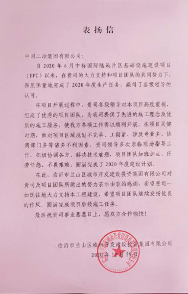 12月29日,市政公司收到臨沂市蘭山區城市開發建設投資集團有限公司發來的表揚信,對由中國二冶承建的山東臨沂國際陸港片區基礎設施項目部保質保量完成2020年各項施工生產任務給予了充分的認可。