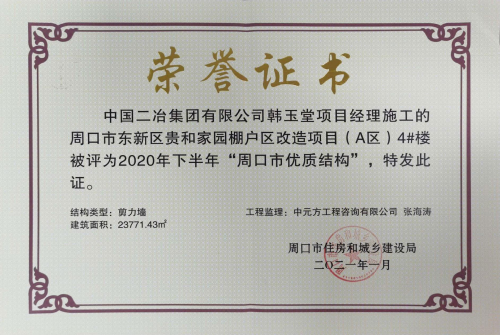 1月18日,河南省周口市住房和城鄉(xiāng)建設(shè)局公布2020年下半年“周口市優(yōu)質(zhì)結(jié)構(gòu)”單位,中國(guó)二冶周口市東新區(qū)貴和家園棚戶區(qū)改造項(xiàng)目(A區(qū))4#樓工程榮獲“周口市優(yōu)質(zhì)結(jié)構(gòu)”榮譽(yù)稱號(hào)。