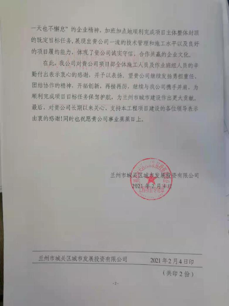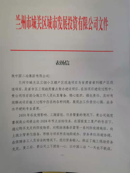 2月5日,中國二冶蘭鋼小區棚戶區改造項目(一期住宅)施工一標段工程項目經理部收到蘭州市城關區城市發展投資有限公司的表揚信,這是業主對中國二冶良好工作作風和積極工作態度的肯定及高度贊揚。