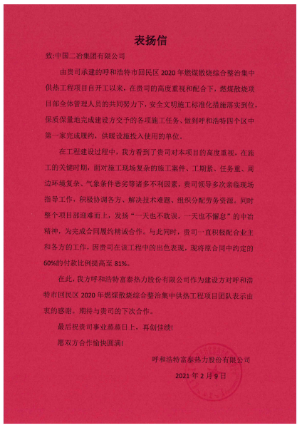 4月30日,內蒙古分公司赤峰市開發試驗區孵化基地項目收到了來自赤峰市資源型城市經濟轉型開發試驗區管理委員會的一封表揚信。業主方表示,由我公司承建的開發試驗區高新技術產業中試孵化基地(一期)建設工程一標段項目作為赤峰市重點建設項目,自開工以來備受社會各界關注。中國二冶作為承建方,在工程建設過程當中保質保量完成任務,盡職盡責體現企業精神,值得稱贊表揚!