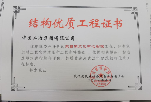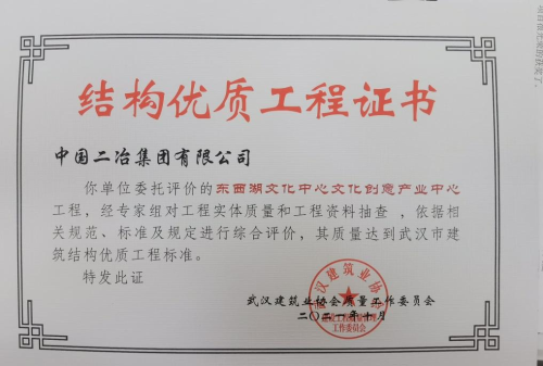 10月16日,由中國二冶承建的武漢東西湖文化中心項目文化創意產業中心及劇院主體結構完成驗收,并獲武漢市優質結構工程獎。
