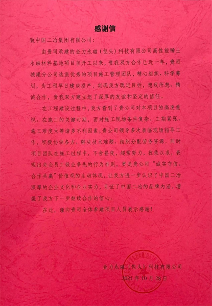 金力永磁(包頭)科技有限公司向中國二冶致感謝信