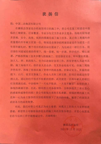11月10日,濉溪縣檔案館致中國二冶表揚信,對中國二在濉溪國家檔案館EPC總承包項目建設中,克服工程建設工期緊張、任務繁重、專業交叉作業多、場地有限等諸多困難,安全、優質、高效地圓滿完成施工任務給予表揚。