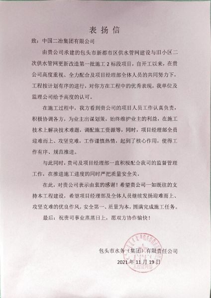 11月24日,包頭市水務(集團)有限責任公司向中國二冶發來表揚信,對中國二冶在新都市區供水管網建設與舊小區二次供水管網更新改造第一批施工2標段項目的建設中用實際行動踐行的“一天也不耽誤,一天也不懈怠”的企業精神及項目人員優秀的專業素質和過硬的技術水平給予充分的肯定和高度贊揚,對管道公司領導給予該工程的重視支持及項目建設人員的付出與努力表示衷心感謝。
