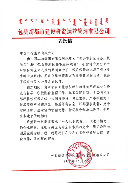 12月21日,包頭新都市建設投資運營管理有限公司致中國二冶表揚信。衷心感謝中國二冶各級領導和全體員工的共同努力,保質保量完成包頭市新都市區商務大廈、新都市區都市庭苑項目各項網絡節點目標,取得良好業績,贏得各方的稱贊和認可。