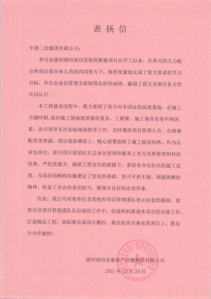 12月28日,湖州南潯金象地產控股集團有限公司致中國二冶表揚信。信中對中國二冶路橋分公司南潯賞悅府住宅小區新建工程項目部夜以繼日、靶向管理、有序施工,保質保量地完成業主方要求節點目標,用實際行動闡釋工程建設高效履約表示高度贊揚。