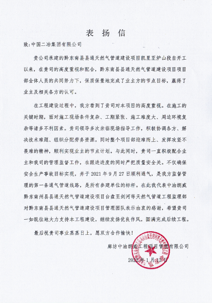 貴州東黎投資股份有限公司在表揚信中指出,在凱里至爐山段線路建設過程中,面對工期緊、任務重、地質條件復雜、氣候多雨等諸多困難下,中國二冶領導多次親臨現場指導工作,項目部全體員工統一思想精細組織管理,合理調配資源,強化安全質量管理、發揮團隊凝聚力,按照計劃節點日期完成施工任務,保證了凱里輸氣站至爐山輸氣站天然氣管道線路順利通氣,在此向中國二冶表示衷心的感謝和誠摯的問候。同時,希望中國二冶繼續發揚誠信履約、顧全大局的央企風范,與我方實現合作共贏,圓滿完成施工任務。