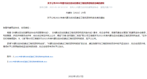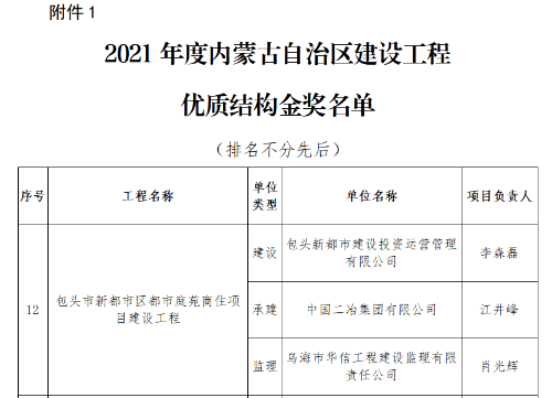 中國二冶兩項目喜獲2021年度內蒙古自治區建設工程優質結構獎