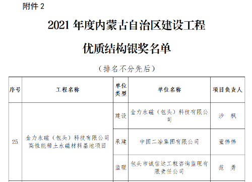 1月19日,由內蒙古自治區建筑業協會發布,經過專家組層層審查、評審,中國二冶兩項目喜獲2021年度內蒙古自治區建設工程優質結構獎。其中,中國二冶城建分公司包頭市新都市區都市庭苑商住項目榮獲2021年度內蒙古自治區建設工程優質結構金獎,金力永磁(包頭)科技有限公司高性能稀土永磁材料基地項目獲得優質結構獎(銀獎),為二冶獎牌榜再添殊榮。