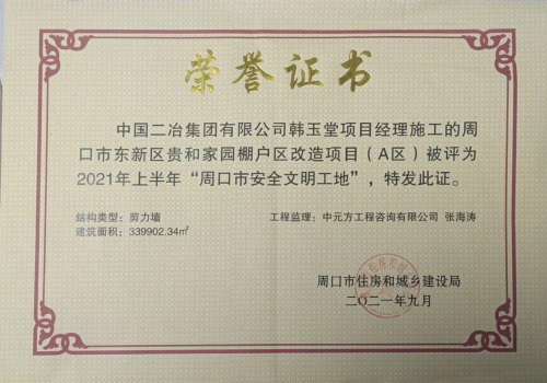 1月23日,中國二冶周口貴和家園項目部收到由周口市住房和城鄉(xiāng)建設局頒布的“周口市安全文明工地”榮譽證書。