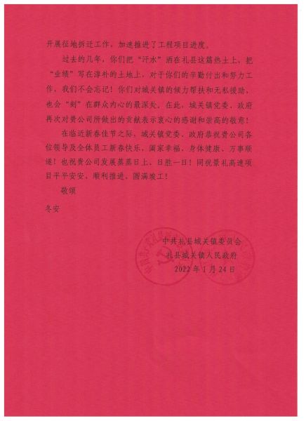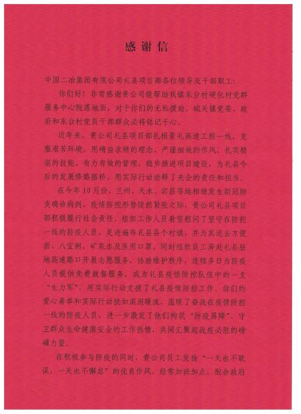 信中指出,非常感謝景禮項目部幫助東臺村硬化村黨群服務中心院落地面,對于貴單位的無私援助,城關鎮黨委,政府和東臺村黨員干部群眾必將銘記于心。2021年10月份,蘭州、天水、宕昌等地相繼發生新冠肺炎確診病例,疫情防控形勢突然緊張之際,景禮項目部積極履行社會責任,組織項目員工慰問了堅守在防控一線的防疫人員,足跡遍布禮縣各個村鎮,并為其送去方便面、八寶粥、礦泉水及醫用口罩,同時組織員工奔赴禮縣駐地高速路口開展志愿服務,協助維護秩序,連續多日為防疫人員提供免費就餐服務,成為禮縣疫情防控隊伍中的一支“生力軍",用實際行動支援了禮縣疫情防控工作。景禮項目部的愛心善舉和實際行動猶如涓涓暖流,溫暖了奮戰在疫情防控一線的防疫人員,進一步激發了他們構筑“防疫屏障”、守衛群眾生命健康安全的工作熱情,共同匯聚起戰疫必勝的碗礴力量。