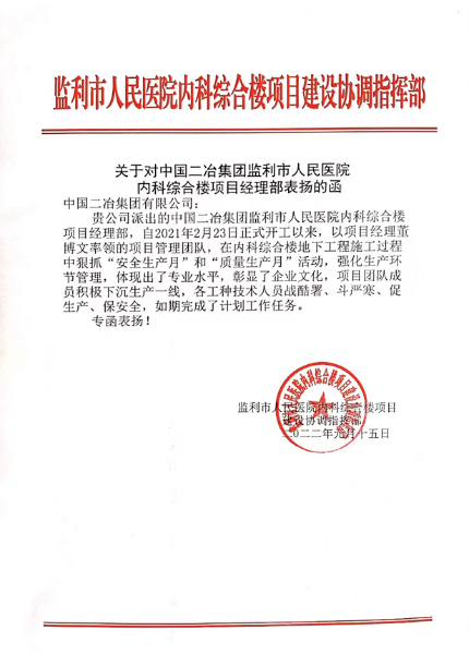 監利市人民醫院在表揚信中指出,自項目開工以來,以項目經理董博文率領的項目管理團隊,在內科綜合樓地下工程施工過程中狠抓“安全生產月”和“質量生產月”活動,強化生產環節管理,體現出了專業水平,彰顯了企業文化,各工種技術人員戰酷署、斗嚴寒、促生產、保安全,如期完成了計劃工作任務。