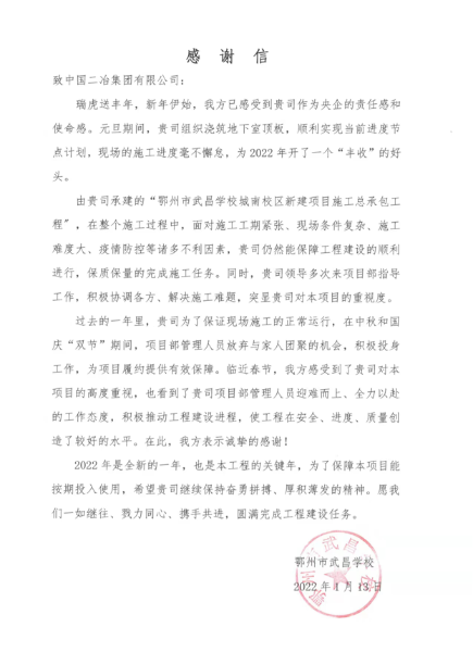 1月20日,中國二冶連續收到來自湖北監利市人民醫院和鄂州市武昌學校發來的表揚信,對中國二冶各級領導給予工程高度重視和大力支持表示衷心感謝。