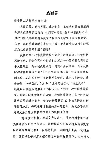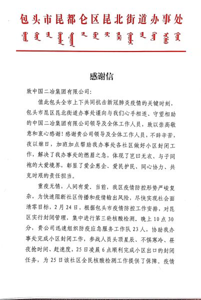 2月25日,包頭市昆區(qū)前進(jìn)街道辦事處、包頭市昆區(qū)街道辦事處致中國(guó)二冶感謝信。信中盛贊中國(guó)二冶在抗擊新冠病毒肺炎疫情的緊要關(guān)頭,攜手相助,迎難而上,彰顯了中國(guó)二冶愛(ài)民護(hù)民、同心協(xié)力、共克時(shí)艱的央企擔(dān)當(dāng),特向中國(guó)二冶集團(tuán)干部職工致以崇高敬意和衷心感謝!