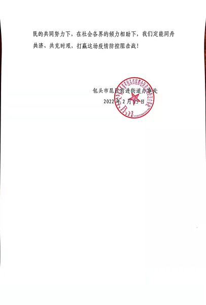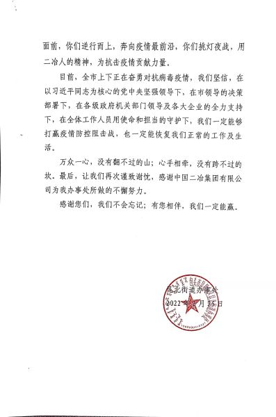 感謝信中寫道,值此包頭全市上下共同抗擊新冠肺炎疫情的關(guān)鍵時(shí)刻,中國(guó)二冶冶金公司第一時(shí)間奔赴昆區(qū)前進(jìn)街道辦事處、昆北街道辦事處,協(xié)助對(duì)所管轄的22個(gè)社區(qū)進(jìn)出口進(jìn)行封閉施工。連續(xù)奮戰(zhàn)不休息,頭頂星辰、不懼寒冷、晝夜搶時(shí)間、趕速度、要效率,幫助辦事處解決了燃眉之急,構(gòu)筑起疫情防控的第一道防線,順利完成所有小區(qū)的封閉任務(wù),為第三次全民核酸檢測(cè)工作提供了有利的保障。疫情面前,你們逆行而上,奔向疫情最前沿,你們挑燈夜戰(zhàn),用二冶人的精神詮釋央企的責(zé)任與擔(dān)當(dāng)。再次感謝中國(guó)二冶集團(tuán)冶金分公司的干部職工,用顆顆愛(ài)心匯聚成打贏這場(chǎng)疫情阻擊戰(zhàn)的磅礴力量!上下同欲者勝,風(fēng)雨同舟者興。
