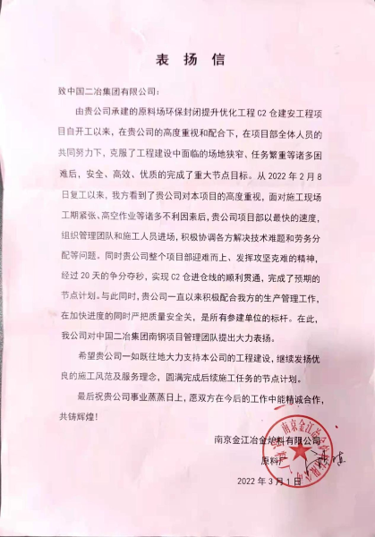 3月1日,南京金江冶金爐料有限公司向中國(guó)二冶致表?yè)P(yáng)信,對(duì)中國(guó)二冶南鋼項(xiàng)目部全體員工在項(xiàng)目施工過(guò)程中做出的成績(jī)和頑強(qiáng)拼搏的精神表示高度贊揚(yáng)。
