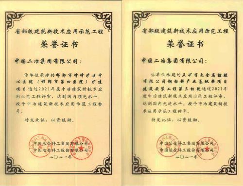 3月28日,中國二冶承建的五礦有色銅鉛鋅產(chǎn)業(yè)基地鋅項目建筑安裝工程第三標段項目和邯鄲市峰峰礦區(qū)中心醫(yī)院(邯鄲市第四醫(yī)院)擴建項目工程榮獲2021年度中國冶金科工集團有限公司、中國冶金科工股份有限公司建筑新技術應用示范工程。