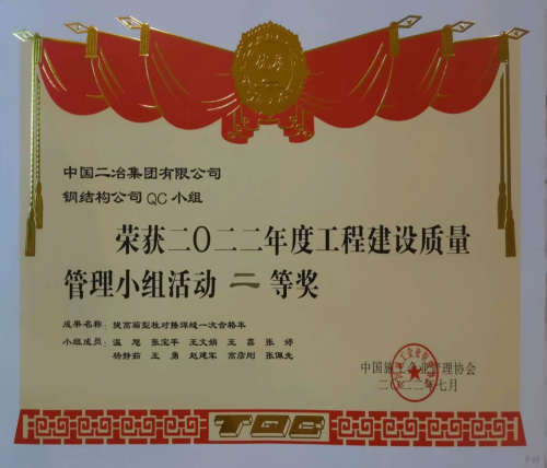 7月25日,由中國施工企業協會舉辦的“2022年工程建設質量管理小組競賽活動”在海南博鰲舉辦。會上,由中國二冶報送的《提高箱型柱對接焊縫一次合格率》QC成果,經過層層篩選和專家評審,最終榮獲2022年度全國工程建設優秀質量管理小組二等獎。