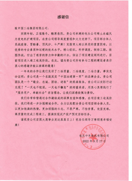 9月26日,包頭中車電機有限公司向中國二冶致表揚信,表揚中國二冶戰疫情、冒酷暑、頂風沙、斗嚴寒,克服重重苦難,保證項目建設順利進行的央企作為,對中國二冶承建的包頭中車項目順利完成各項工程節點和任務目標表示認可。