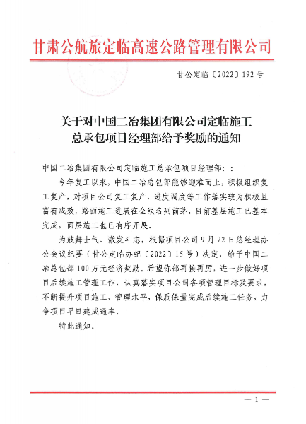 10月18日,甘肅公航旅定臨高速公路管理有限公司發布通報,對中國二冶定臨項目部能夠迎難而上,積極組織復工復產等工作進行表揚,并給予100萬元經濟獎勵。