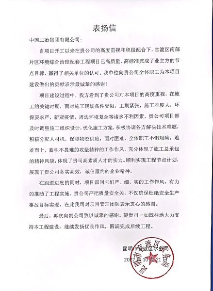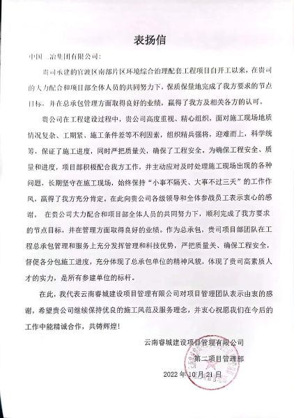 10月22日,中國二冶官渡項目部連續收到兩封來自業主單位昆明市官渡區水務局和云南睿城建設項目有限公司的表揚信,對中國二冶路橋分公司官渡項目部在官渡區南部片區環境綜合治理配套工程項目建設過程中,直面多種困難,精心策劃、科學管理、全力以赴的工作態度表示贊賞。