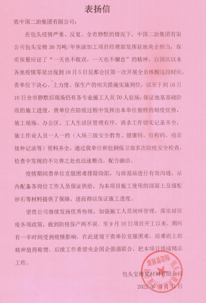 10月31日,中國二冶包頭寶楷30萬噸/年焦油加工項目部收到包頭寶楷炭材料有限公司表揚(yáng)信,對該項目在施工過程中積極籌備各項工作,特別是在此次包頭疫情形勢嚴(yán)峻的情況下,下大決心,上狠力度,保施工進(jìn)度的行為給予表揚(yáng)。