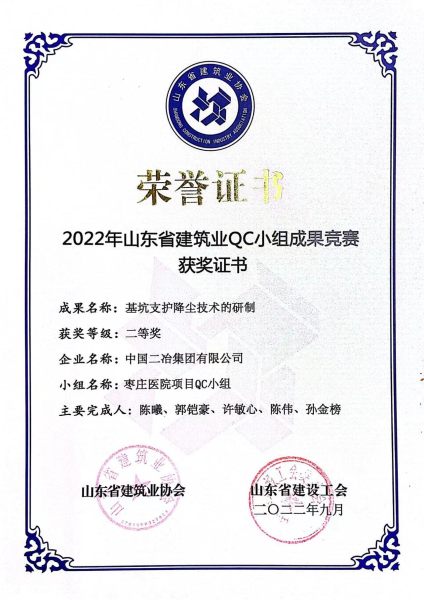 11月7日,由山東省建筑業(yè)協(xié)會(huì)和山東省建設(shè)工會(huì)聯(lián)合開展的2022年度山東省建筑業(yè)QC小組成果競賽活動(dòng)成績揭曉,中國二冶山東分公司棗莊人民醫(yī)院項(xiàng)目部QC小組研究課題《基坑支護(hù)降塵技術(shù)的研制》在活動(dòng)中榮獲二等獎(jiǎng)。