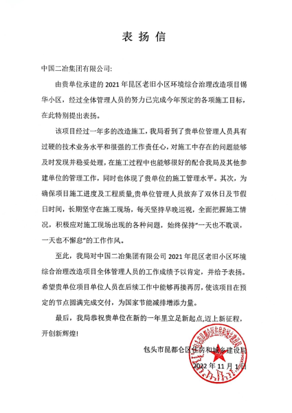 11月3日,包頭市昆區(qū)住建局致中國二冶表揚(yáng)信,對(duì)中國二冶在昆區(qū)老舊小區(qū)項(xiàng)目建設(shè)中疫情防控、工程質(zhì)量表示認(rèn)可,并對(duì)中國二冶的項(xiàng)目管理團(tuán)隊(duì)給予充分肯定和感謝。