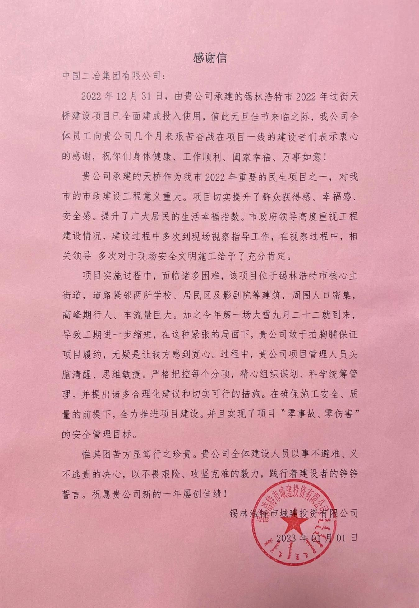1月3日,中國二冶路橋分公司錫林浩特市過街天橋項(xiàng)目收到業(yè)主單位錫林浩特市城建投資有限公司感謝信,對(duì)中國二冶不畏艱險(xiǎn)、攻堅(jiān)克難,圓滿完成項(xiàng)目建設(shè)任務(wù)表示高度贊揚(yáng)。