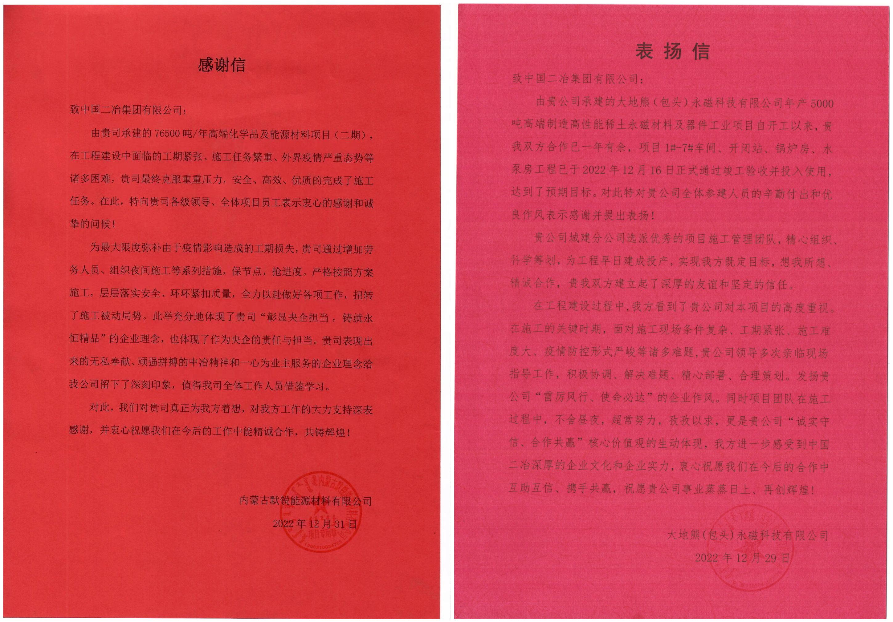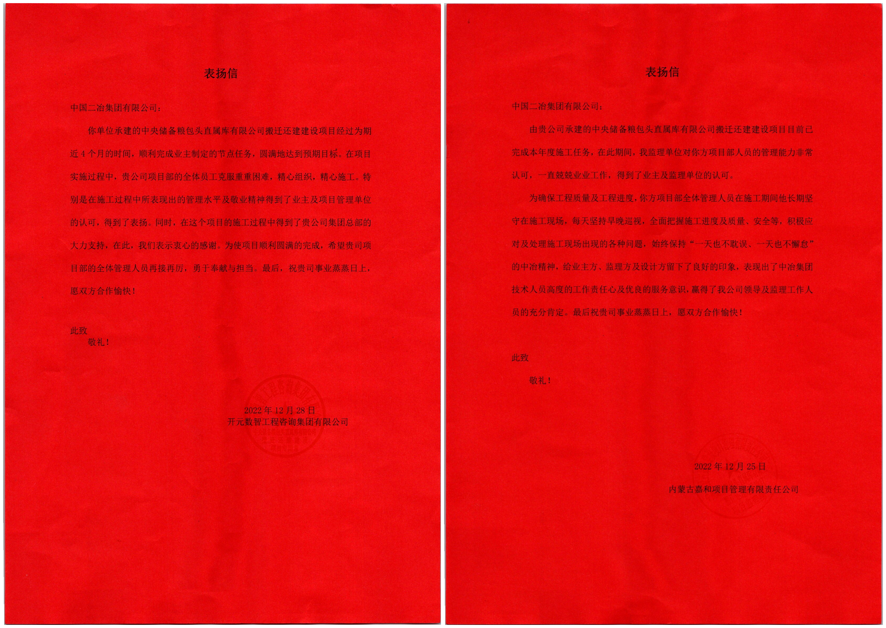 歲末年關(guān),中國二冶承建的達(dá)旗默銳項(xiàng)目、大地熊項(xiàng)目、中儲糧項(xiàng)目接連收到業(yè)主及各方表揚(yáng)信,對各項(xiàng)目克服難題順利推進(jìn)工程建設(shè),按計劃完成預(yù)期施工目標(biāo)表示高度贊揚(yáng),對公司及參建團(tuán)隊為總工期目標(biāo)奠定的堅實(shí)基礎(chǔ)表示祝賀和感謝。