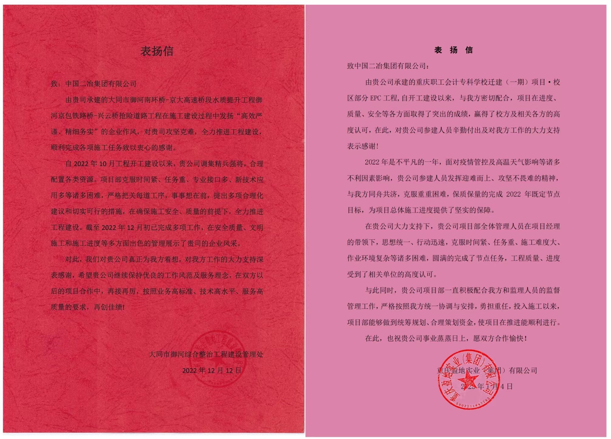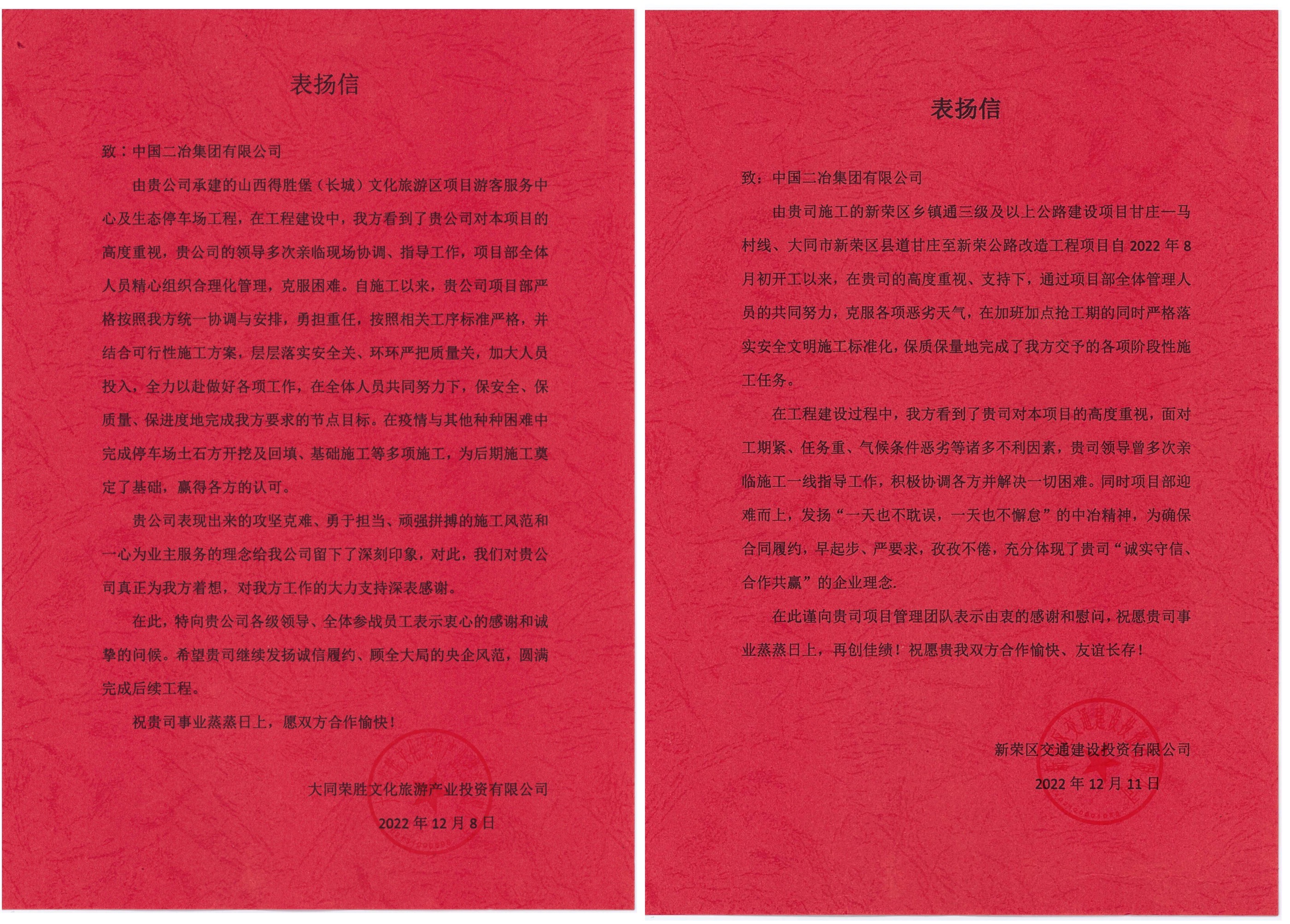 歲末年初,中國(guó)二冶各項(xiàng)目部陸續(xù)收到所承建的大同市新榮區(qū)迎賓路等市政工程項(xiàng)目、山西得勝堡游客服務(wù)中心及生態(tài)停車場(chǎng)工程項(xiàng)目、大同市新榮區(qū)新甘馬三級(jí)公路項(xiàng)目、山西得勝堡得勝?gòu)V場(chǎng)景區(qū)道路及工程管線工程項(xiàng)目、大同市御河搶險(xiǎn)道路工程項(xiàng)目、重慶職工會(huì)計(jì)??茖W(xué)校遷建(一期)項(xiàng)目以及金盛快速路北段——杭蓋路連接線項(xiàng)目共計(jì)七個(gè)項(xiàng)目業(yè)主單位的表?yè)P(yáng)信。