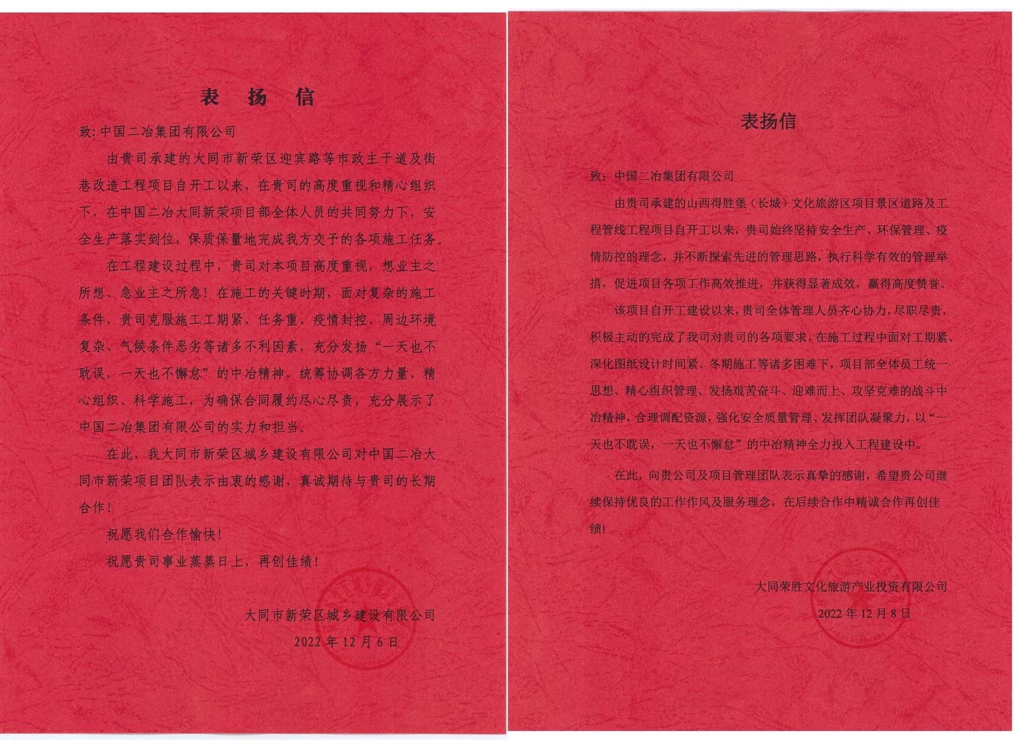山西得勝堡得勝?gòu)V場(chǎng)景區(qū)道路及工程管線工程項(xiàng)目業(yè)主單位大同榮勝文化旅游產(chǎn)業(yè)投資有限公司來(lái)信表?yè)P(yáng):項(xiàng)目自開工建設(shè)以來(lái),項(xiàng)目部全體員工統(tǒng)一思想、精心組織管理、發(fā)揚(yáng)艱苦奮斗、迎難而上、攻堅(jiān)克難的中冶精神,合理調(diào)配資源,強(qiáng)化安全質(zhì)量管理、發(fā)揮團(tuán)隊(duì)凝聚力,以“一天也不耽誤,一天也不懈怠”的企業(yè)精神全力投入工程建設(shè)中。 在此,向貴公司及項(xiàng)目管理團(tuán)隊(duì)表示真摯的感謝,希望貴公司繼續(xù)保持優(yōu)良的工作作風(fēng)及服務(wù)理念,在后續(xù)合作中精誠(chéng)合作、再創(chuàng)佳績(jī)!