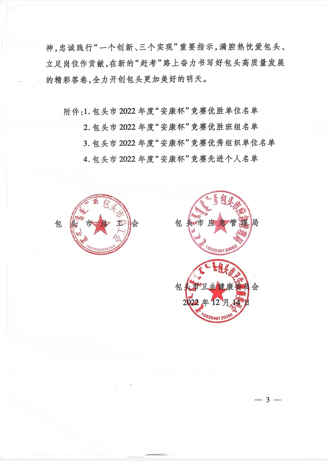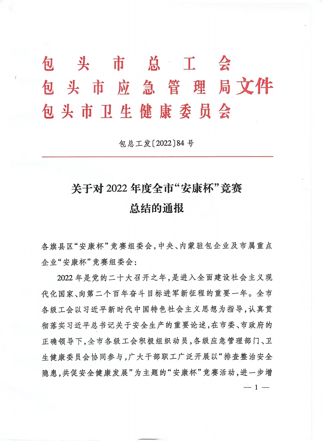 “安康杯”競賽活動是由包頭市總工會和包頭市應急管理部及包頭市衛生健康委員會聯合組織的安全生產競賽評比活動,旨在通過競賽安全生產管理、領導者安全生產意識、職工安全生產知識水平和能力、安全生產各項指標評比,不斷推動企事業單位的安全生產工作和安全文化建設,不斷擴大社會影響,提高全民安全生產意識,最終降低各類事故的發生率和各類職業病的發病率。