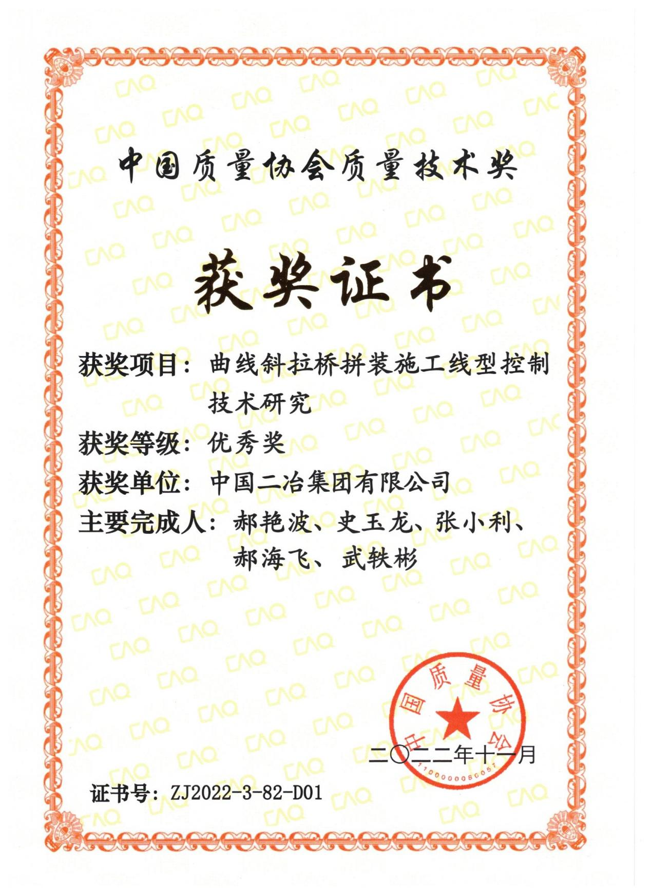 精益求精,鑄就品質典范。2月9日,中國二冶收到中國質量協會頒發的證書,由公司申報的“曲線斜拉橋拼裝施工線型控制技術研究”榮獲2022年度中國質量協會質量技術進步優秀獎。