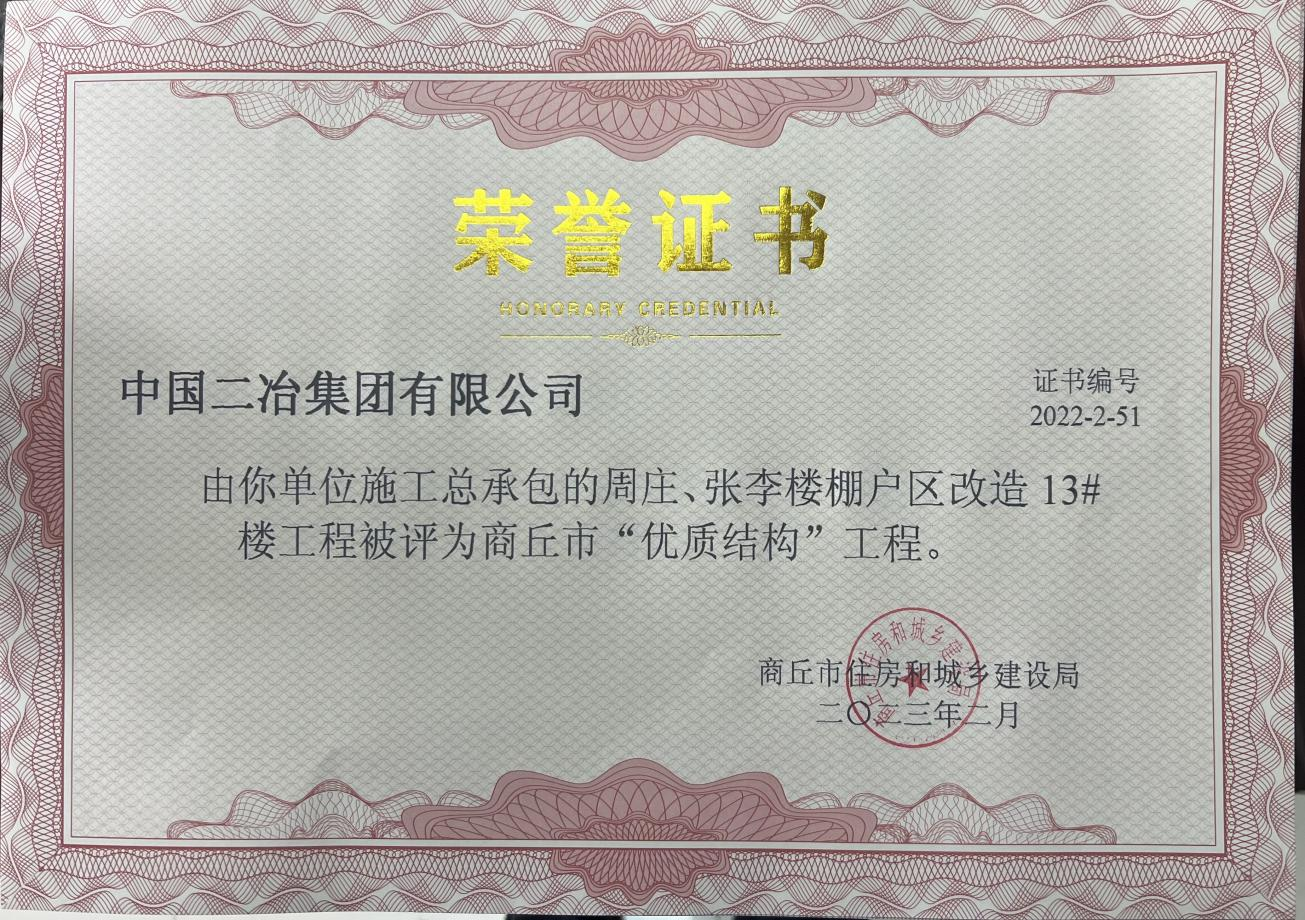 2月10日,由中國二冶承建的虞城周莊、張立樓棚戶區(qū)改造13#樓工程榮獲河南省商丘市住房和城鄉(xiāng)建設(shè)局頒發(fā)的2022年度“優(yōu)質(zhì)結(jié)構(gòu)工程獎(jiǎng)”。