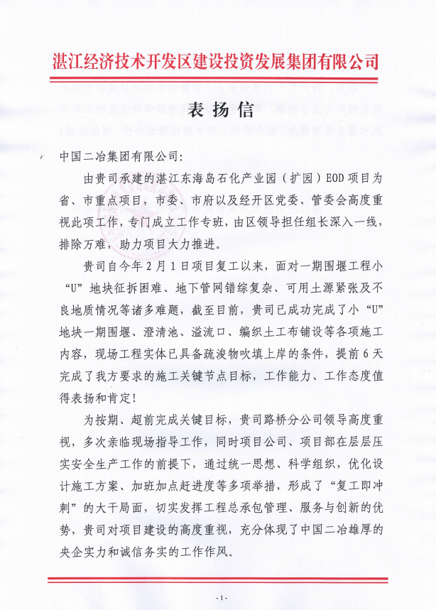 信中寫道,湛江東海島產業園(擴園)EOD項目為廣東省、湛江市重點項目,市委市政府及經開區黨委、管委會高度重視該項目工作。自2月1日復工以來,面對疏浚物急需吹填上岸,施工工期急劇縮短的嚴峻形勢下,中國二冶迎難而上,克服地下管網錯綜復雜、土資源緊張等一系列困難,精心策劃、統籌管理、科學組織,優化設計施工方案、加班加點趕進度,形成了“復工即沖刺”的大干局面,切實發揮工程總承包管理、服務與創新的優勢,在確保安全生產的前提下,超前完成施工任務,充分彰顯了中國二冶雄厚的央企實力和誠信務實的工作作風。湛江經濟技術開發區建設投資發展集團有限公司對中國二冶及項目團隊表示衷心地感謝!
