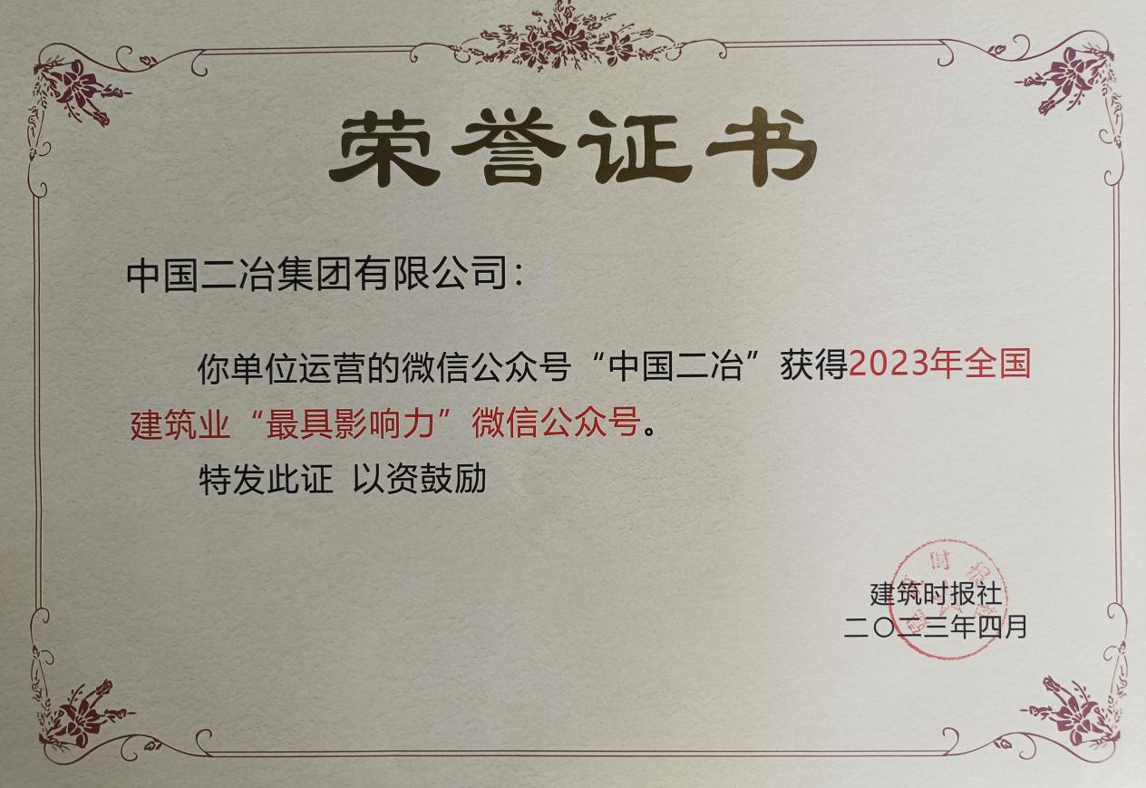 中國二冶微信公眾號榮獲2023年全國建筑業最具影響力公眾號