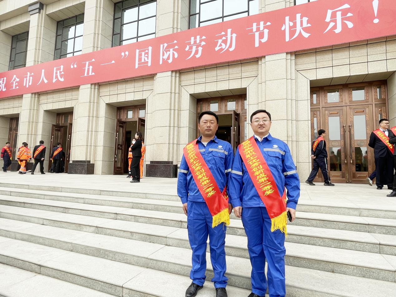 王康潭(左)發明的“可調錯邊、間隙管道外對口器組對施工工法”榮獲“十大先進操作法”