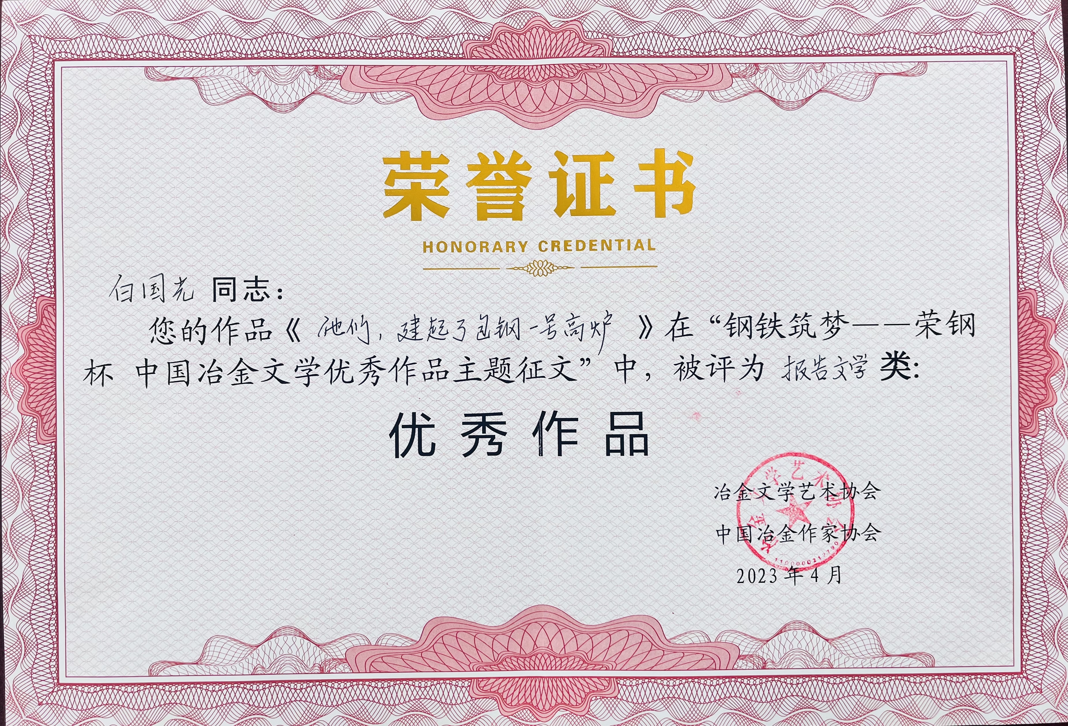近日,由冶金文學(xué)藝術(shù)協(xié)會(huì)、中國(guó)冶金作家協(xié)會(huì)舉辦的“鋼鐵筑夢(mèng)——榮鋼杯”中國(guó)冶金文學(xué)優(yōu)秀作品主題征文評(píng)選結(jié)果揭曉,中國(guó)二冶在此次活動(dòng)中榮獲優(yōu)秀組織獎(jiǎng),原四川分公司職工白國(guó)光創(chuàng)作的《他們,建起了包鋼一號(hào)高爐》被評(píng)為報(bào)告文學(xué)類優(yōu)秀作品。